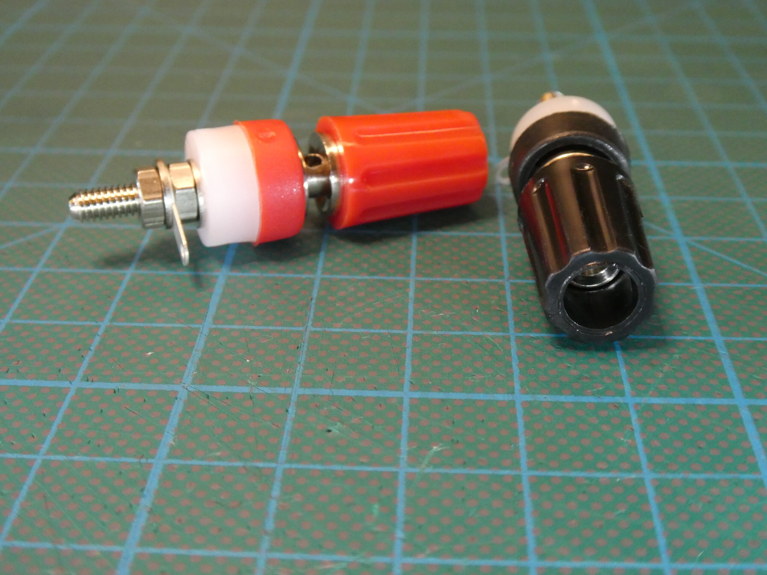 Bindingspost for 4mm bananplugger, kabelsko eller nakne ledningsender. Har både loddeøre og skrufeste. Maks belastningsstrøm 15A. Maksimal lengde er 43mm og maksimal diameter er 13mm. Passende monteringshull er 4mm eller 7mm avhengig av om den monteres med den medfølgende hylsen eller ikke. Finnes i flere farger.