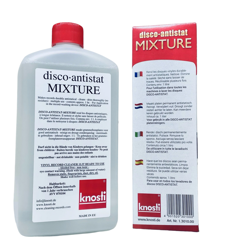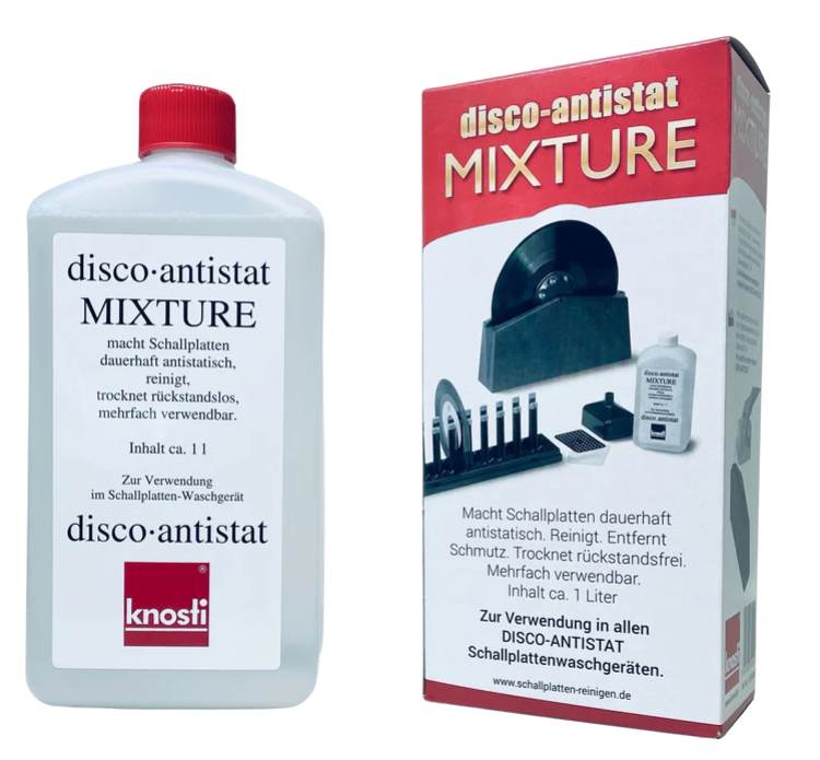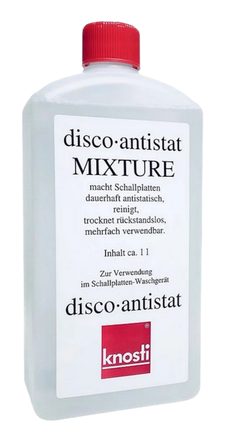 Knosti Disco-Antistat Mixture er en alkoholfri rensevæske spesiallaget for Knosti platevaskere. Rensevæsken forenkler rengjøring og pleie av dine verdifulle vinylplater. Med denne kan du enkelt og grundig rengjøre gamle og sterkt tilsmussede plater. Platene blir umiddelbart antistatiske etter et bad i Disco-Antistat Mixture. I test ser man at selv med sensitive måleinstrumenter kan man ikke lenger påvise statisk elektrisitet.
