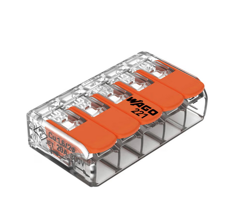 Koblingsklemme for 5 ledere av alle typer. Tverrsnitt 0,14-4mm2 fintrådet/0,2-4mm2 helkjerne/flertrådet Nominell spenning: 450V, Nominell strøm 32A, Temperatur 105 grader