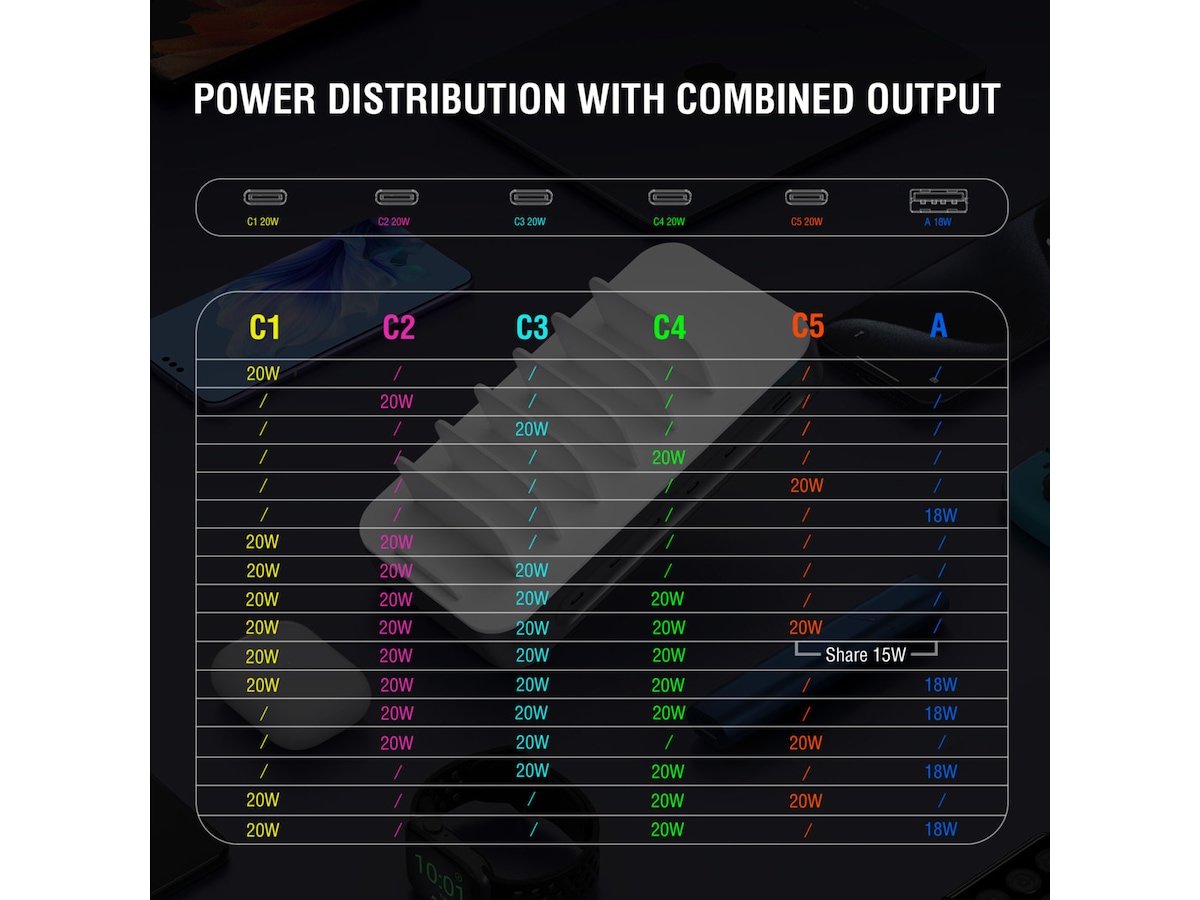- Rask ladning: Lad opptil 5 enheter parallelt med 20 watt.