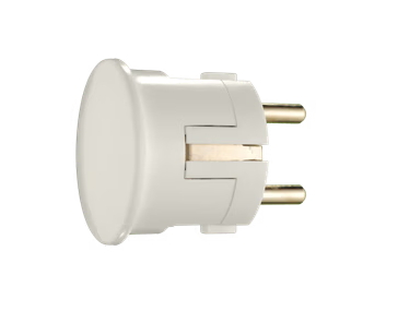 Støpsel i hvit plast med kabelinnføring på siden. Jordet, IP20, egnet for innomhus bruk.