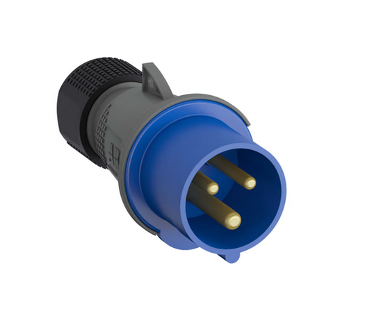 Blå plugg rundstift IP44. Merkerstrøm 16A , 2 faser + jord. Passer blant annet i strømstolper på campingplasser og marinaer.