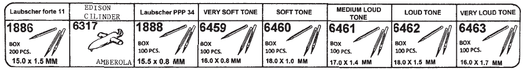 I grammofoner var det ikke elektroniske forsterkere som vi har i dag. I stedet ble volumet bestemt av fasongen og størrelsen til nåla. Derfor leveres disse stålnålene i ulike varianter fra laveste lydnivå («very soft tone») til høyeste lydnivå («very loud tone»). Disse leveres i pakker med 100 nåler. Se produktbildet for utvalget av grammofonnåler vi tilbyr. Vi lagerfører som standard «soft tone».
