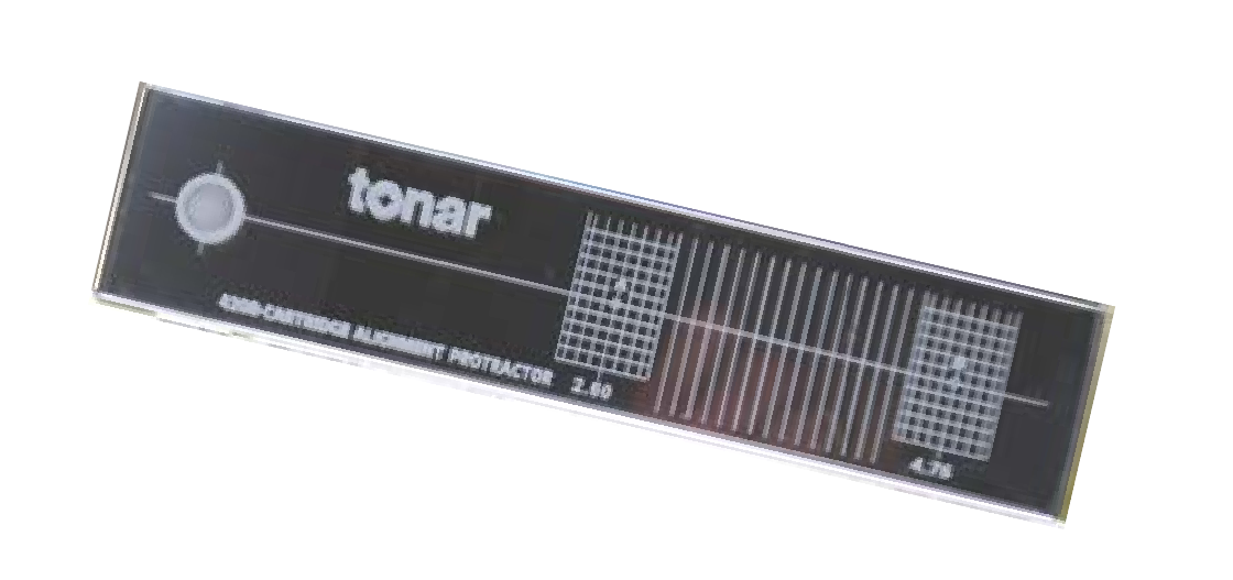 Korrekt justering av pickupen din vil hjelpe deg å oppnå best mulig lydkvalitet. Tonar Simple Alignment Protractor er et rimelig verktøy som lar deg montere og justere pickupens stift riktig for optimal sporing i rillene og maksimal gjengivelse av musikken. Speilet gjør det enkelt å kontrollere utkragerens azimuth (vinkel).
